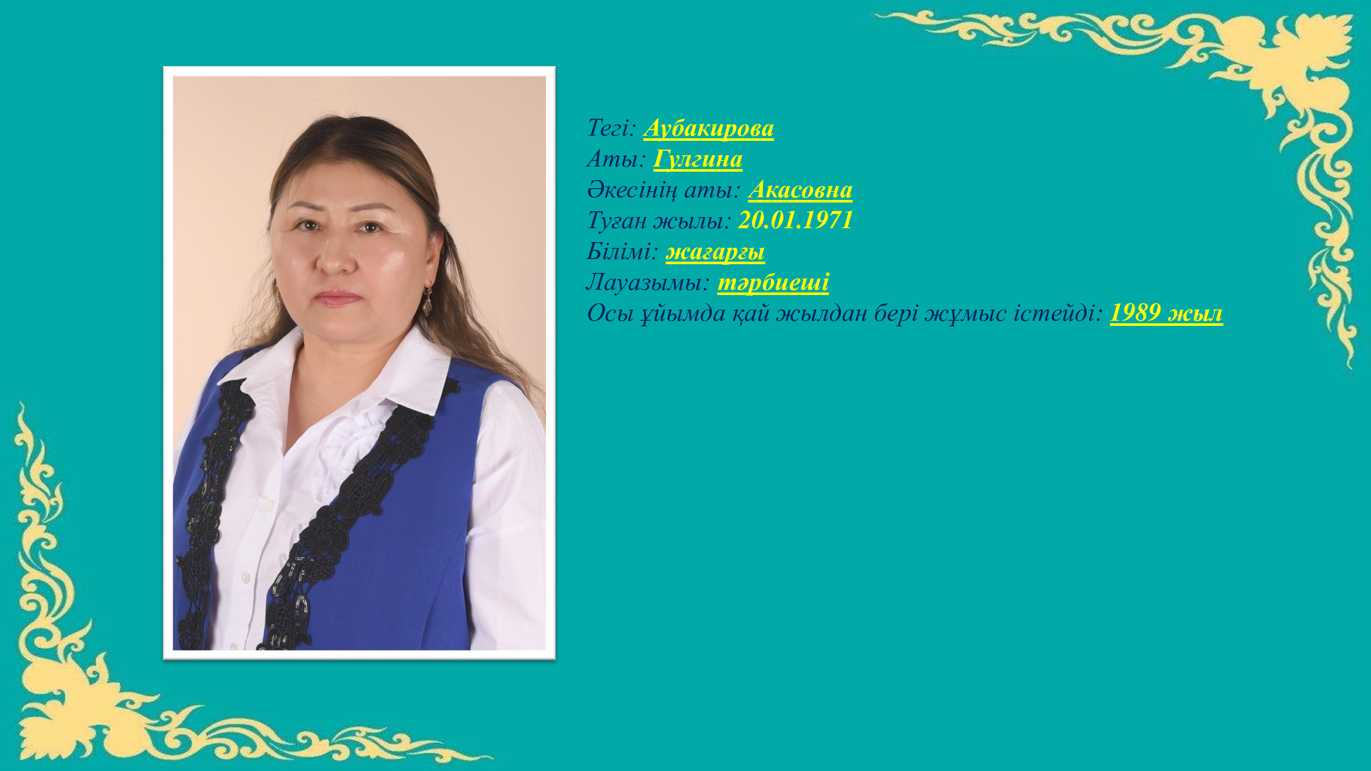 Тәрбиеші Аубакирова Гулгина Акасовна